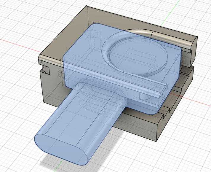 Pour l’accrocher facilement, j’ai modélisé sur Autodesk Fusion un support adapté. Deux trous permettent d’y glisser un zip réutilisable.